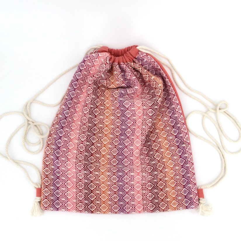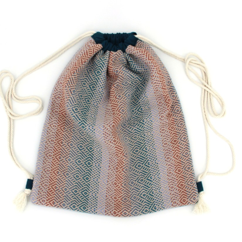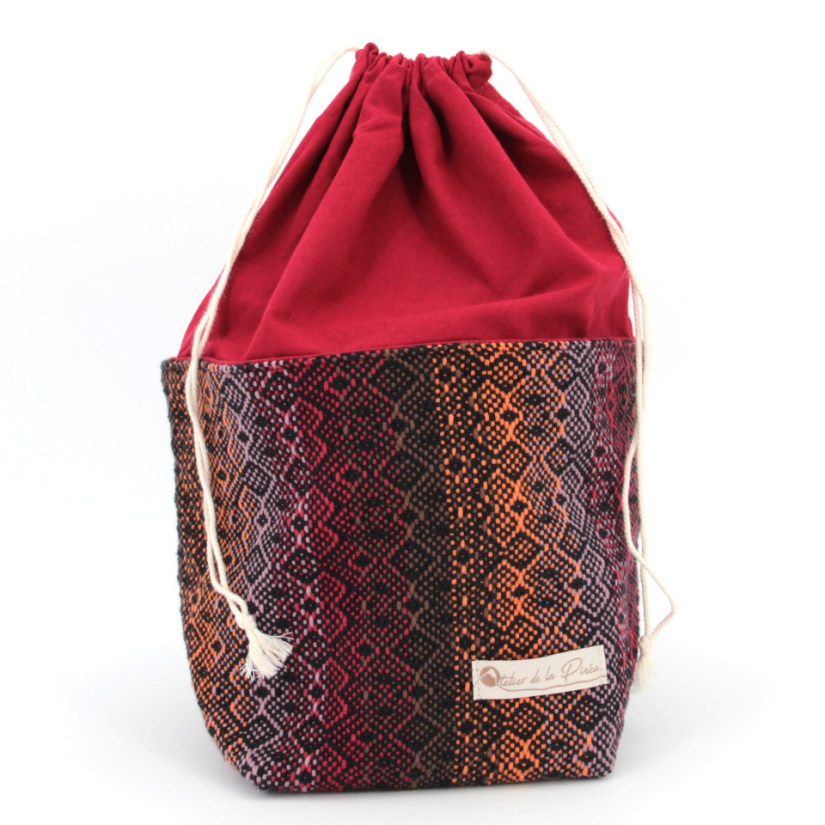Fermeture de la rehausse par cordon. A l’intérieur du sac, une petite poche ouverte ainsi qu’un cordon muni d’un mousqueton. Dimensions 49 x 33 x 10 cm